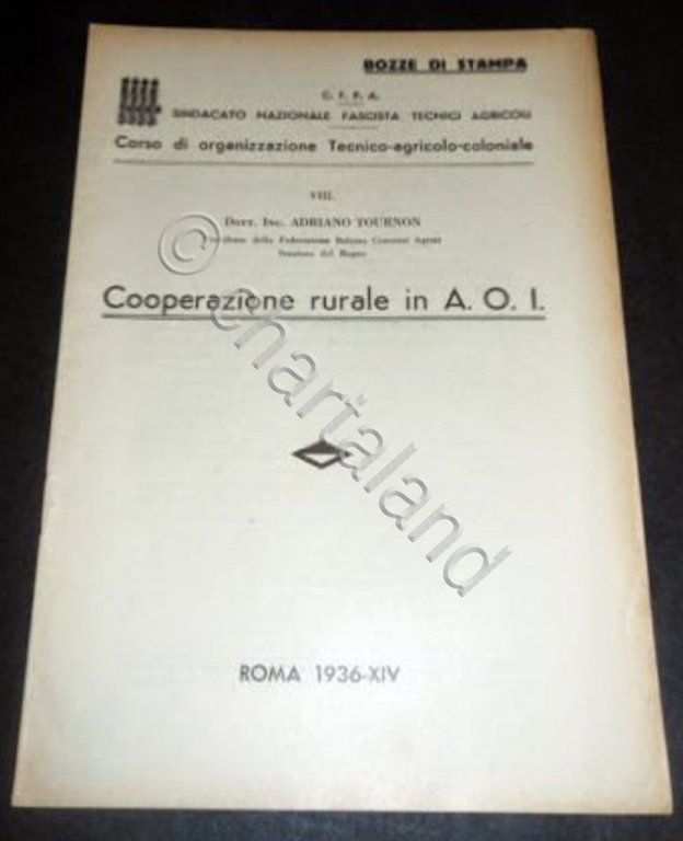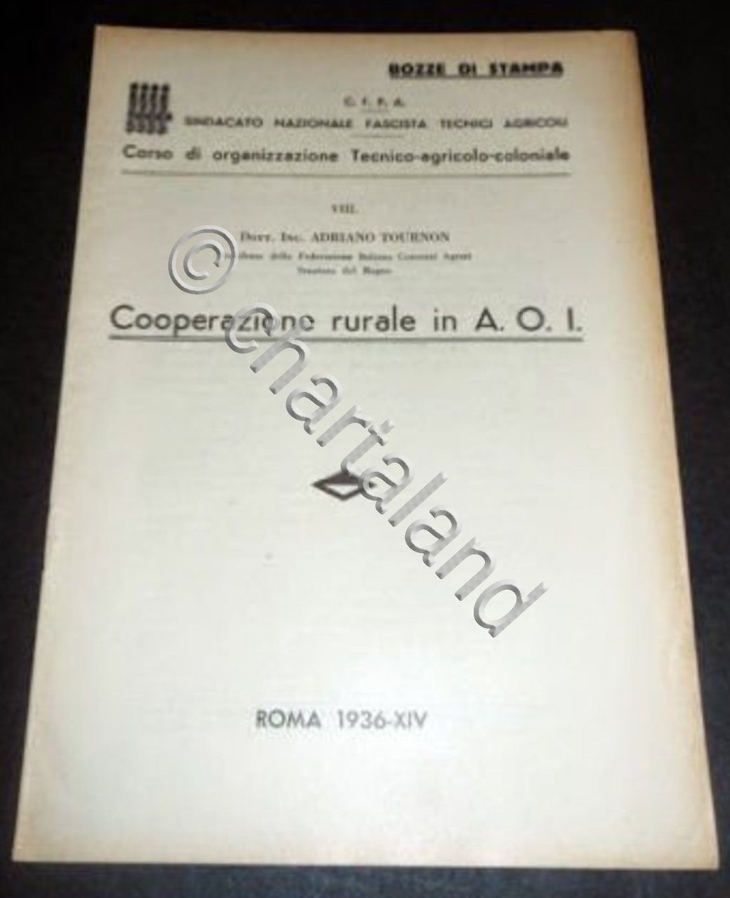 Corso di Organizzazione Tecnico Agricolo Coloniale Adriano Tournon - Cooperazione rurale in A.O.I. - 1^ ed. 1936 Pag. 16 Copertina morbida - Testo in italiano. Condizioni molto buone.