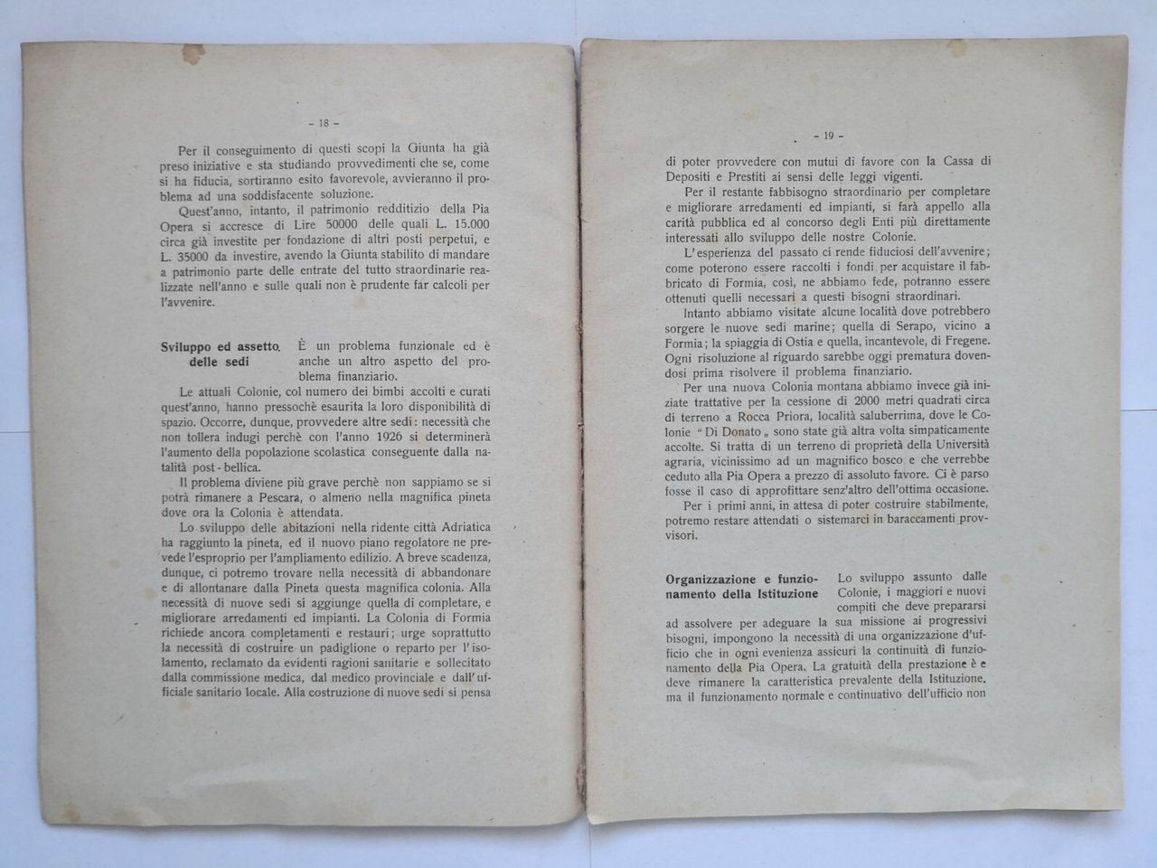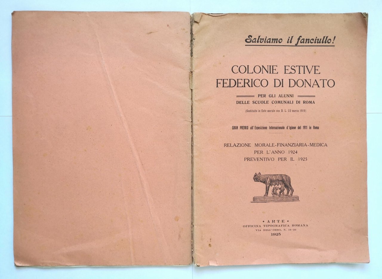 COLONIE ESTIVE "FEDERICO DI DONATO". Per gli alunni della Scuole Comunali di Roma. Relazione morale-finanziaria-medica per l'anno 1924, preventivo per il 1925.
