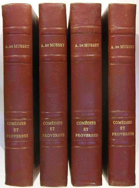 Edition Louis Conard libraire éditeur, Paris, 1926 à 1935. Quatre volumes in/8 (21 x 15 cm) reliure demi-chagrin brique, dos à nerfs à titres dorés, illustrations de Nourigat gravées sur bois par Victor Dutertre, 480, 482, 392 & 446 pages. Contiennent : On ne saurait penser à tout, Carmosine, Bettine, Le songe d'Auguste, L'âne et le ruisseau, Il ne faut jurer de rien, Un caprice, Il faut qu'une porte soit ouverte ou fermée, Louison, Lorenzaccio, La quenouille de Barberine, Le chandelier, La nuit vénitienne, André del Sarto, Les caprices de Marianne, Fantasio, On ne badine pas avec l'amour.