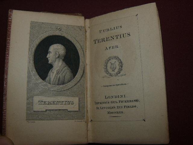 In-64°(8,6x5 cm.) , antiporta con ritr. inciso del Terenzio, 2 front., dedica al Conte Spencer, pp. 220, leg. in tela edit. con tit. su tassello di carta rovinato. Curiosa collezione di classici in miniatura stampati dall'editore G. Pickering di Londra. 'L'editore inglese Pickering iniziò, nel 1822, la pubblicazione di una serie di piccoli libri con caratteri microscopici e coi titoli leggibili ad occhio nudo.'