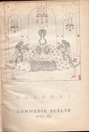 Legatura in seta nera a fiori rosa, nome dell'autore a sbalzo in copertina, fregi di Duilio Cambellotti. Contiene Gl'innamorati, La casa nova, Le baruffe chiozzotte, Il ventaglio e Il burbero benfico
