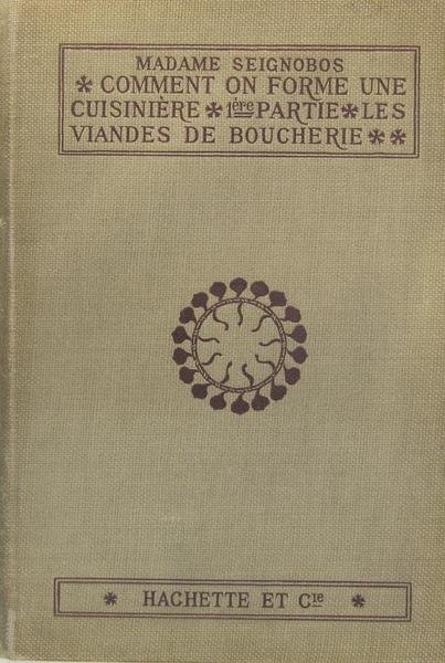 Hachette, Paris, 1913. In/8 reliure toile éditeur, couvertures conservées, illustrations in-texte, 82 pages. Mors intérieur ouvert. Un utile mémento de la cuisinière sur la durée des cuissons; Le boeuf, le mouton, le veau, le porc frais. et au préalable quelques conseils à la ménagère de 1913 : comment faire son feu, le fourneau au charbon, la cuisine au gaz, comment on devient rôtisseur. Joli couverture conservée en couleur et pages de garde à tête de coqs.