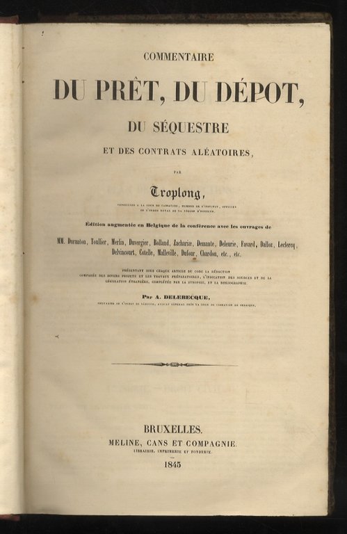 Commentaire du prêt, du dépot, du séquestre et des contrats aléatoires.