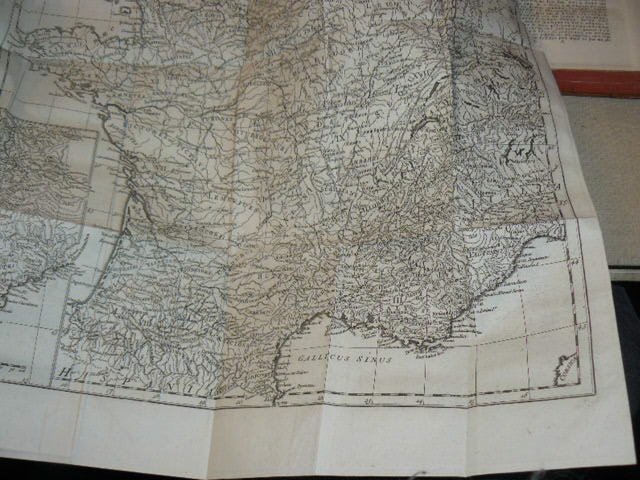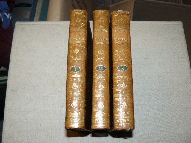 3 voll. in-8°, pp. (4),XXII,(2),319, 14 tavv. f.t. incise in rame più volte rip., una grande carta della Gallia antica; (4),328, 12 tavv. f.t. più volte rip.; (4),434, 13 tavv. f.t. più volte rip., frontespizi in rosso e nero, bella legatura dell'epoca in piena pelle color nocciola, titolo e fregi in oro al dorso. Il volume contiene: Commentarii de bello Gallico, Bellum Alexandrinum, Bellum Africanum, Bellum Hispaniense, Commentarii de bello civili.