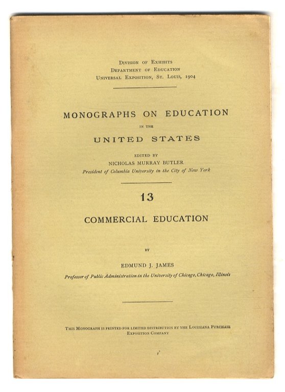 St. Louis, Universal Exposition, Department of Education, 1904, in-8, br. editoriale, pp. 51. Monographs on Education in the United States, edited by Nicholas Murray Butler, n. 13.