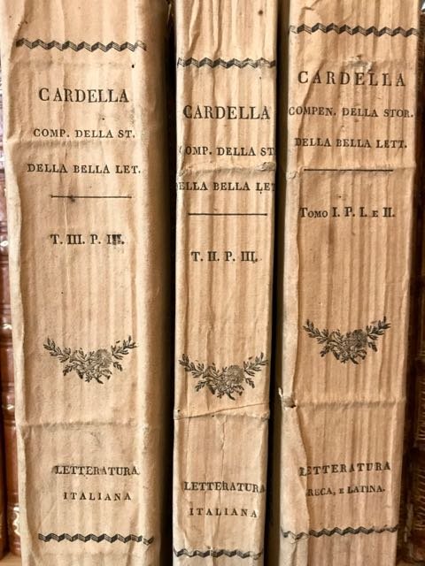 3 volumi in-8° (cm. 21,2), brossure editoriali a stampa; pp. [4] 488, 355, 513 in barbe e in buono stato; lievi bruniture. Edizione originale di questa interessante storia letteraria. Bell'esemplare completo e genuino.
