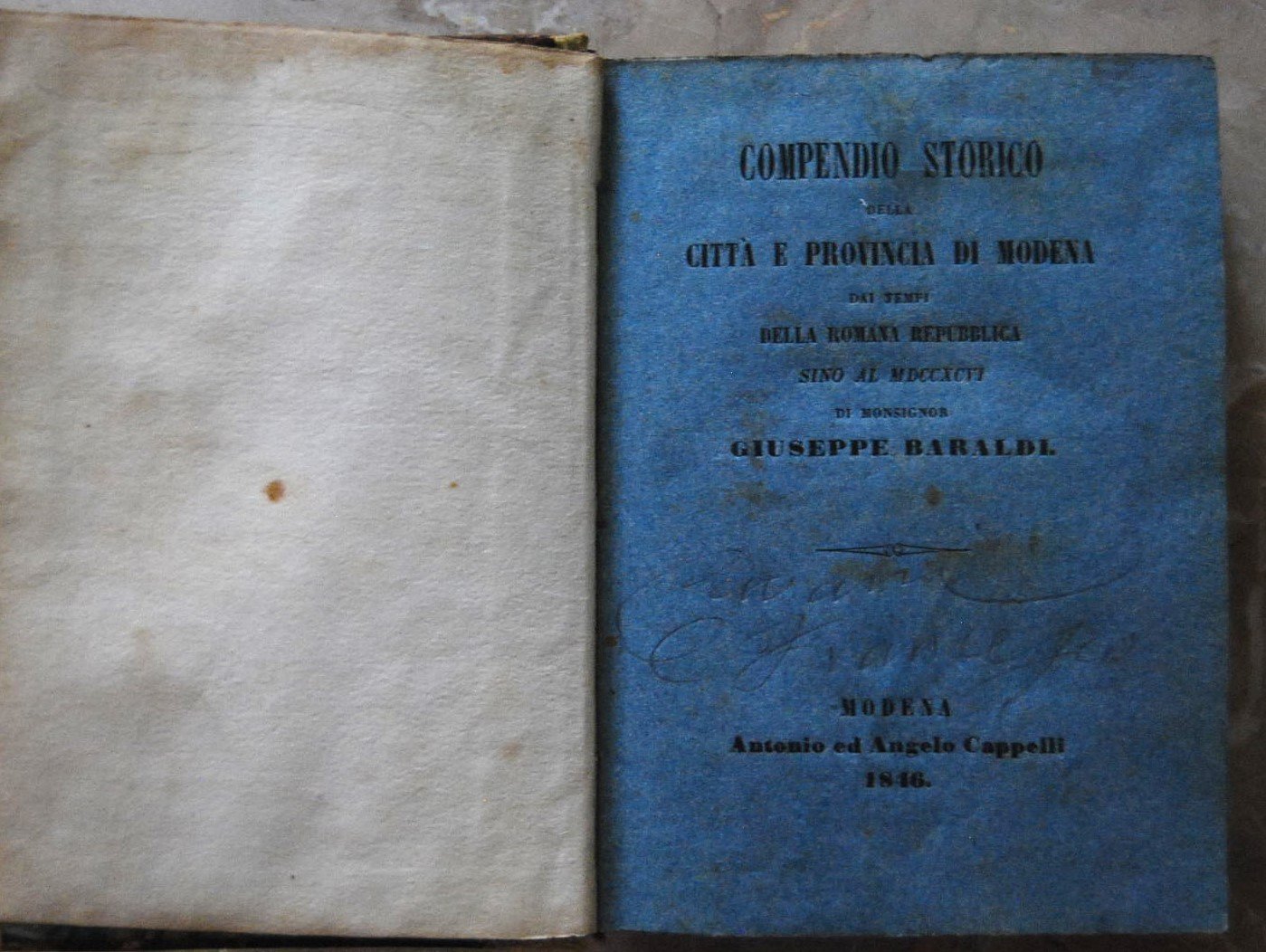 Antonio e Angelo Cappelli, 1846. In-16, mezza pergamena, tassello con titolo oro al dorso, pp. 340. Unito a: Modena al tempo de' Bonacolsi. Scene storiche del secolo XIVdi Francesco Mandredini. Presso Antonio e Angelo Cappelli, 1846, pp. 146. Tracce d'uso alla legatura esterna, pagine interne, sono di coloro azzurro, in ottimo stato