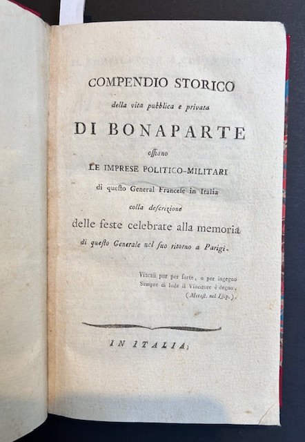 Compendio storico della vita pibblica e privata di Bonaparte ossiano le imprese politico - militari di questo general francese in Italia. Colla descrizione delle feste celebrate alla meoria di questo generale nel suo ritorno a Parigi.