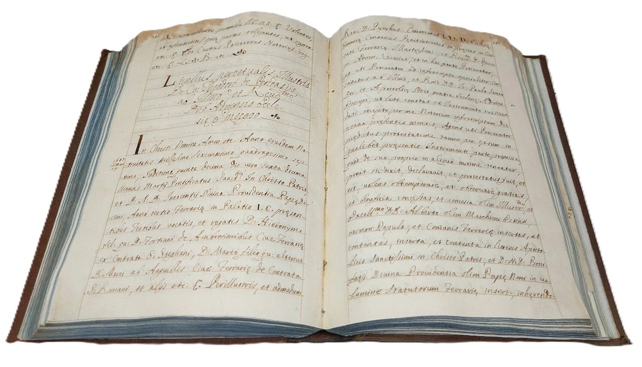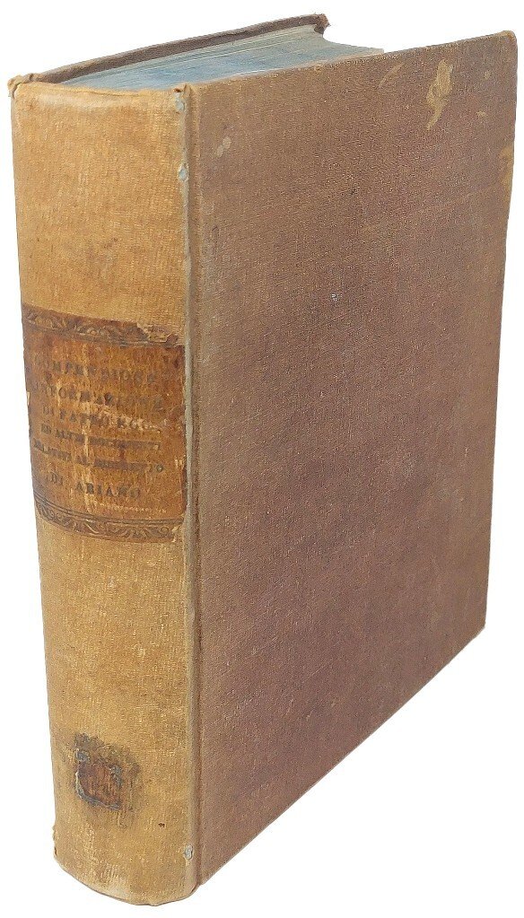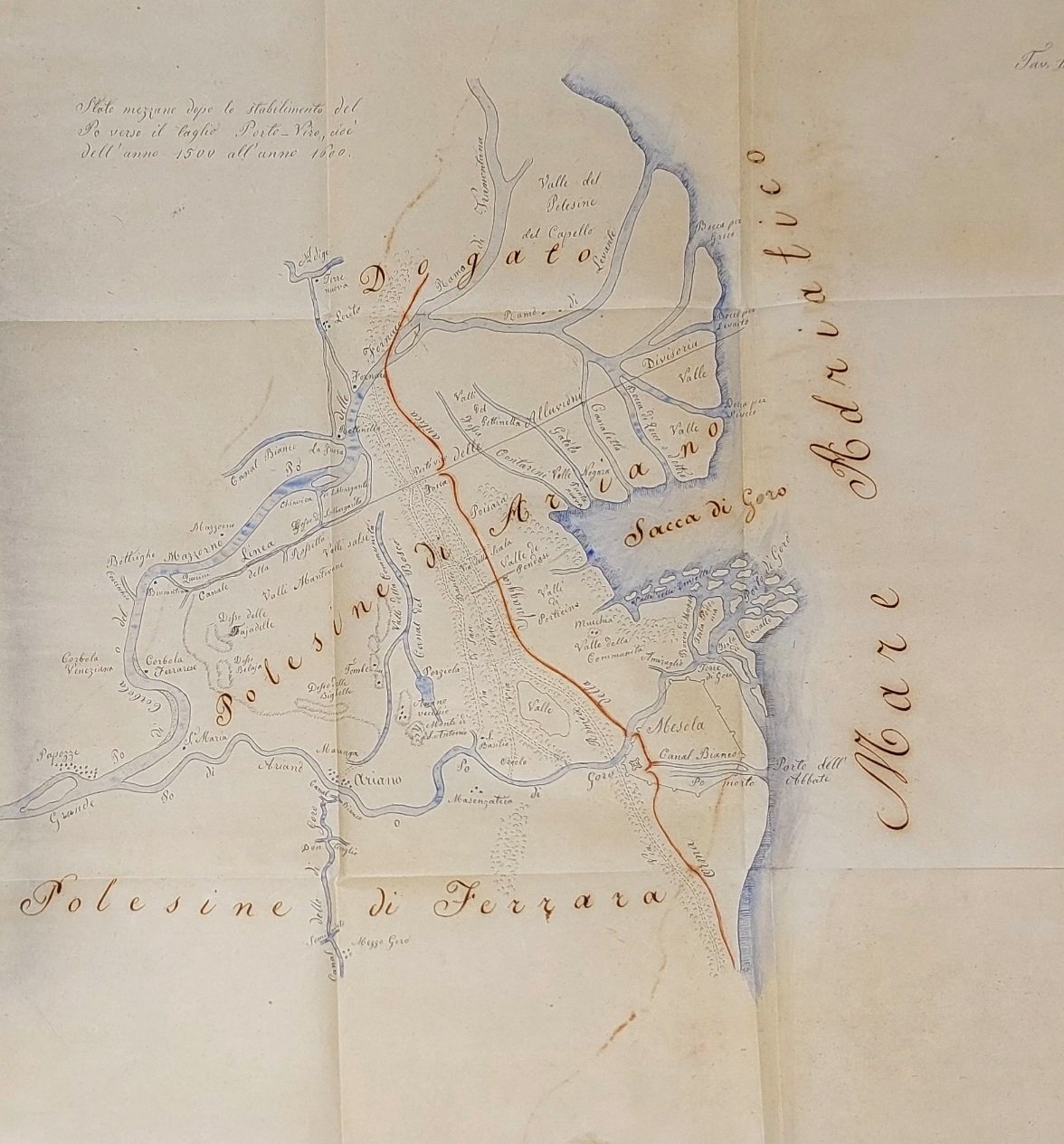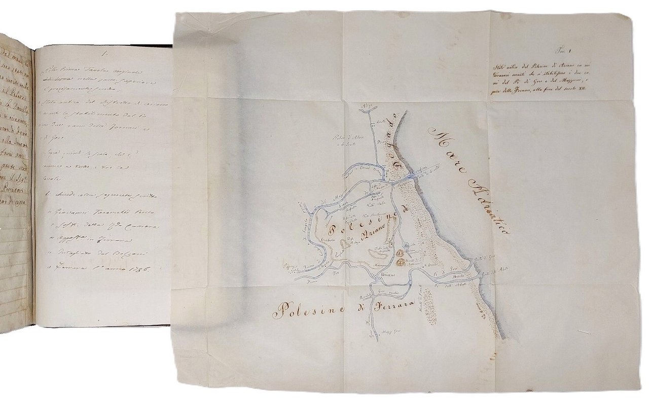 >manoscritto in-4 (mm 280x200) pp. (3), 153; (6, dei quali 1 frontespizio, 1b., 4 di indice dei documenti), 296, 6 (num.1-3, bianche al verso) contenenti 3 belle tavole topografiche mss. a colori ripieg. f.t, 15 ff., (20b.), il tutto vergato in chiara grafia. Legatura antica tutta tela con titolo su tassello al dorso, tagli azzurri. Trattasi di copia ms. delle opere stampata nel 1735 e 1736, presumibilmente a Ferrara, concordemente attribuita ad Eustachio Manfredi di Lugo, morto nel 1739 e i cui manoscritti erano conservati nella biblioteca di Bologna. Il volume tratta della controversia tra lo stato pontificio e la repubblica veneta, causata dai mutamenti del delta, dovuti al fiume Po e causanti la mutazione dei confini tra i due stati. L'opera a stampa è rarissima, poiché si dice fu fatta ritirare e distruggere dal Papa Benedetto XIV, in quanto pregiudiziale delle ragioni della Santa Sede verso lo Stato Veneto. Del presente manoscritto ne esisteva una copia presso l'università di Padova, ma priva delle tre tavole a colori. Il volume risulta così diviso: a) “Compendiosa osservazione…” pp. 1-153. - b) Raccolta dei documenti citati nella scrittura per parte della Santa Sede, intitolata compendiosa…1735, (6), 296.- c) Tre tavole a colori riproducenti quelle incise da Bolzoni sui disegni di Giovanni Giacomelli perito camerale in Ferrara: 1) Stato antico del Polesine di Ariano in cui trovasi avanti che si stabilissero i due rami del Po di Goro e del Mazzorno o pure delle fornaci alla fine del sec. XII. 2) Stato di mezzo del distretto d'Ariano dopo lo stabilimento del Po verso il taglio di Porto-Viro cioè dell'anno 1500-1600. 3) Stato presente del distretto d'Ariano nell'anno 1735. d) Aggiunta di varie iscrizioni nella chiesa di Ariano (1857), pp. 1-15. Le pp. 1-16 (parte a), 217-222 (parte b), le 3 tavole con relative note e le aggiunte in fine, sono di mano diversa e risalenti al 1857. Manoscritto assai importante per la storia e la topografia di questa zona Ferarrese al Delta del Po. Ben conservato, a parte aloni nei margini. Passano G., Anonime e pseudonime, p. 77