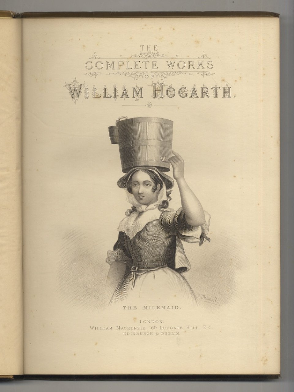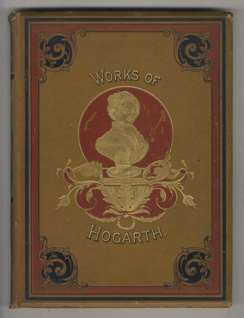 London, William Mackenzie, [c. 1880], un solo volume in-4, legatura editoriale in piena tela con ricca figurazione in nero rosso ed oro sul piatto anteriore (un busto di Hogarth), tagli dorati pp. [2], numerate da 187 a 210, [1]. Con antiporta e frontespizio incisi e 34 tavole incise che riproducono opere di Hogarth. Si tratta di un solo volume d'una edizione di sei volumi.