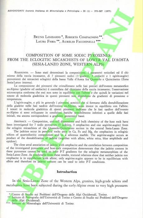 Composition of some sodic pyroxenes from the eclogitic micaschists of lower Val d'Aosta (Sesia-Lanzo Zone, Western Alps) . Metamorphic evolution and fold history in the eclogitic micaschists ot the upper Gressoney valley (Sesia-Lanzo Zone, Western Alps) .