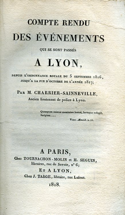 In-8°, pp. (4), 150, 66 di 'Pièces justificatives', brossura editoriale azzurra con titolo calligrafato al tempo al piatto. Ottimo esemplare in barbe. Prima edizione. 'Charrier-Sainneville (1768-1840), administrateur français, était lieutenant de police à Lyon lorsque sa brochure Compte Rendu des événements qui se sont passés à Lyon attira l'attention du gouvernement sur la conspiration factice du 8 Juin 1817, et devint ainsi en butte à des haines puissantes, par suite desquelles il rentra dans la vie privée.' (Quérard, II, 140). Quérard, cit.