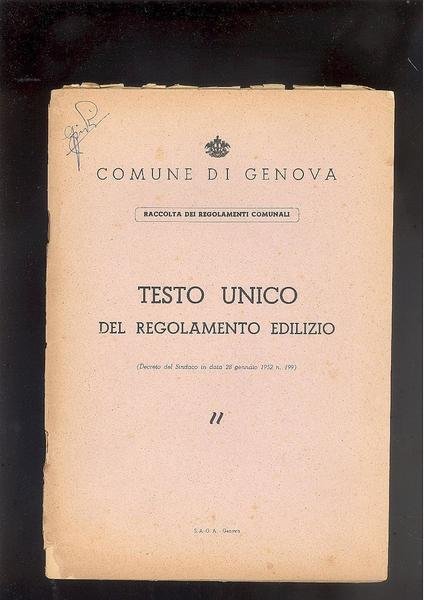 IN 8°, pp.56 + 1 c.+v.r. f.t. CON LA PLANIMETRIA ALLEGATA AL REGOLAMENTO EDILIZIO DELLA CITTA' DI GENOVA, COPERTINA EDITORIALE IN BROSSURA CON TITOLO.<BR>E' IL TESTO UNICO DEL REGOLAMENTO EDILIZIO DEL COMUNE DI GENOVA ( DECRETO DEL SINDACO IN DATA 28 GENNAIO 1952 n.199 ) OTTIMA CONSERVAZIONE.ID 2108