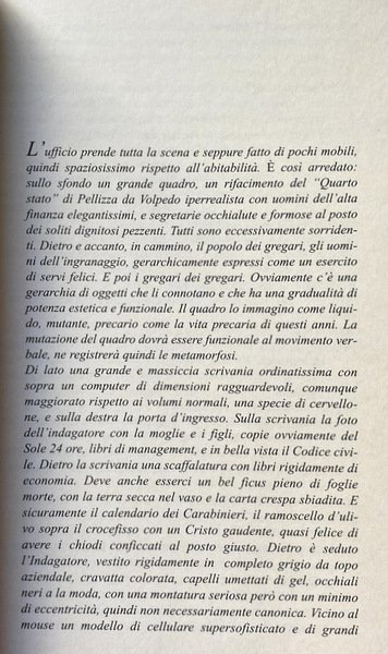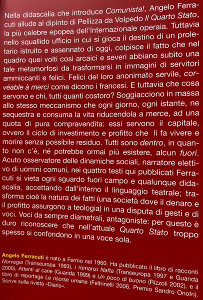 Nella didascalia che introduce "Comunista!", Angelo Ferracuti allude al dipinto di Pellizza da Volpedo "Il Quarto Stato", la più celebre epopea dell'Internazionale operaia. Tuttavia nello squallido ufficio in cui si gioca il destino di un proletario istruito e assennato di oggi, colpisce il fatto che nel quadro quei volti così arcaici e severi abbiano subito una tale metamorfosi da trasformarsi in immagini di servitori ammiccanti e felici. Felici del loro anonimato servile, "corvéable a merci", come dicono i francesi. E tuttavia che cosa servono e chi, tutti quanti costoro? Soggiacciono in massa allo stesso meccanismo che ogni giorno, ogni istante, ne sequestra e consuma la vita riducendola a mercé, ad una quota di pura compravendita: essi servono il capitale, ovvero il ciclo di investimento e profitto che li fa vivere e morire senza possibile residuo. Tutti sono dentro, in quanto non c'è, né potrebbe ormai più esistere, alcun fuori. Acuto osservatore delle dinamiche sociali, narratore elettivo di uomini comuni, nei quattro testi qui pubblicati Ferracuti si vieta ogni sguardo fuori campo e qualunque didascalia, accettando dall'interno il linguaggio teatrale; trasforma cioè la natura dei fatti (una società dove il denaro e il profitto assurgono a teologia) in una disputa di gesti e di voci. Voci da sempre diametrali, antagoniste: per questo è duro riconoscere che nell'attuale Quarto Stato troppo spesso si confondono in una voce sola.
