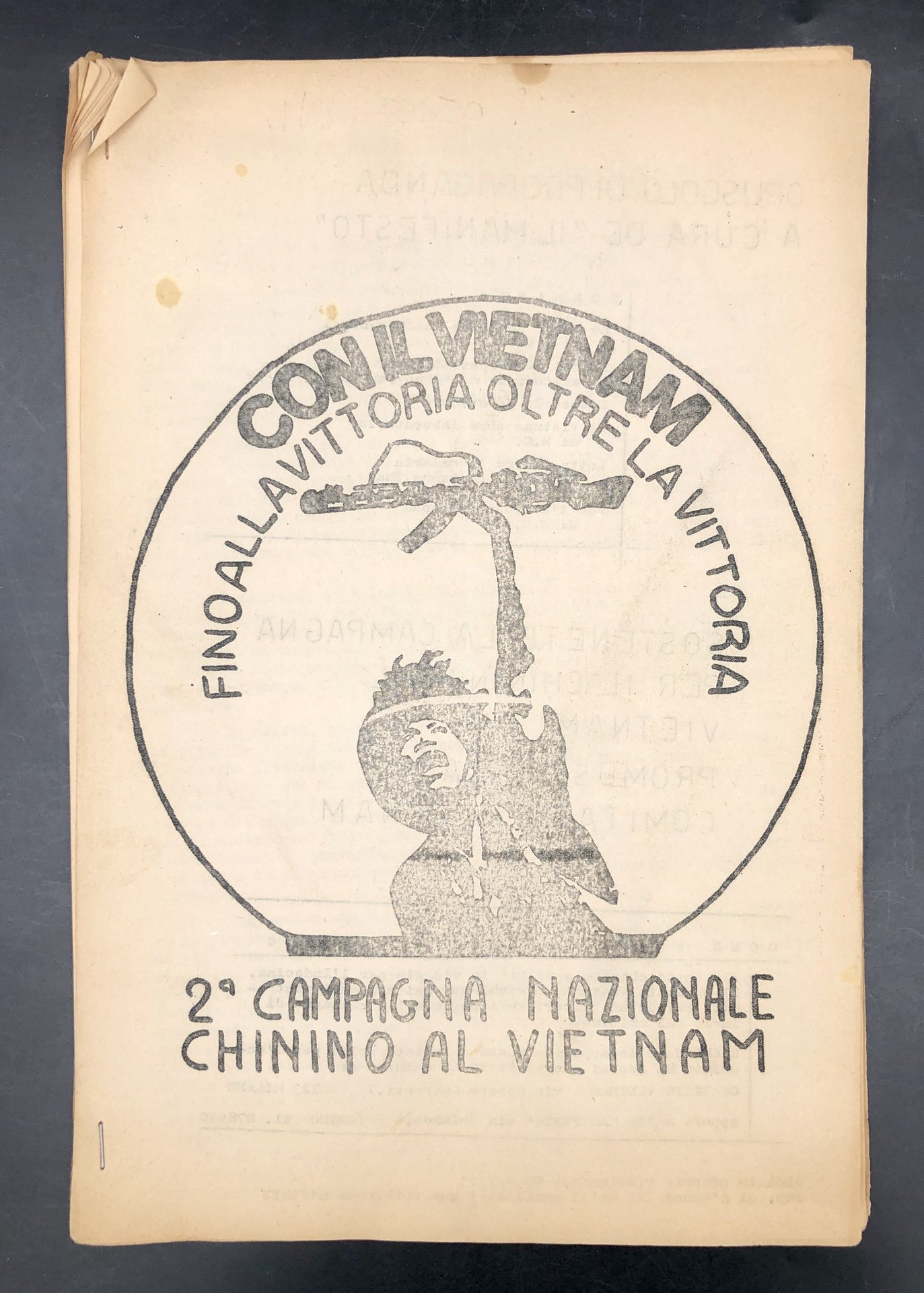 Fascicolo pinzato a graffette, cm. 33x22), 26 pagine ompresse fronte e verso, aon alcune cartine e vignette. Munito di copertna con grafica b.n. Contiene: 1) le modalità per la raccolta dal Chinino. 2) Le bombe non sono una parentesi di L. N. 3) Di chi la responsabilità? Editoriale del "Nhan Dan" del 3/12/1972. 4) L'accordo di ottobre. 5) Il Vietnam come laboratorio, di N.C. 6) Lotta contro la malaria del dott. Do Duong Thai. 6) Per l'aiuto al Vietnma , di E. C. P. Quest'ultimo articolo è mutilo, crediamo, di almeno una pagina. La "guerra di resistenza contro gli Stati Uniti" durò dal 1º novembre 1955 (data di costituzione del Fronte di Liberazione Nazionale filo-comunista) al 30 aprile 1975 (con la caduta di Saigon). Suppl. al n. 6, a. III de "il manifesto", aut. trib. roma n° 13812. Documento introvabile del giornale che fu l'organo dell'omonimo movimento politico italiano di estrema sinistra attivo dal 1969 al 1974, che allra usciva di sole 4 pagine.