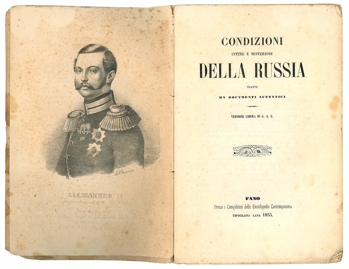 In 8vo (mm 247x161); pp. 169, [3], [1] c. di tav. fuori testo. Bel ritratto litografico dell'imperatore Alessandro II realizzato da G. Stracca all'antiporta. Lievi aloni e leggere fioriture marginali. Brossura editoriale. Copertine un po' sporche e con qualche mancanza al dorso.