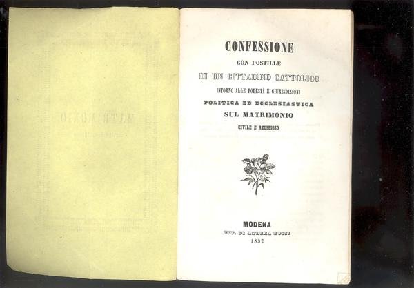 CONFESSIONE CON POSTILLE DI UN CITTADINO CATTOLICO INTORNO ALLE PODESTA' E GIURISDIZIONI POLITICA ED ECCLESIASTICA SUL MATRIMONIO CIVILE E RELIGIOSO.
