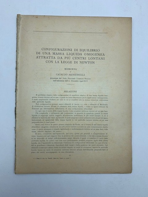 In 4 (cm 23 x 32 circa), pp. 48. Brossura rifatta. Stralcio dalle Memorie dell'Accademia delle scienze di Torino. serie II, parte I, tomo 71. Ristampa 1951 della lezione di fisica di Cataldo Agostinelli presentata da Tommaso Boggio nell'adunanza dell'11 novembre 1942.