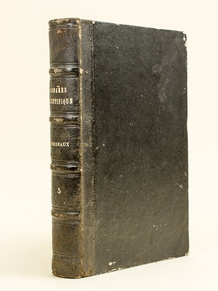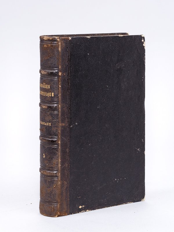 1 vol. in-8 reliure demi-chagrin noir, Chez Derache, Paris, Chez Coderc, Degréteau et Poujol, Bordeaux, 1861, 1864, 584 pp. et 1 f. Contient : Mémoires de la Cinquième Section : Histoire et Description de la Bibliothèque Publique de la Ville de Bordeaux et aperçu des principaux ouvrages, soit imprimés, soit manuscrits, qu'elle renferme (J.-B. Gergerès) - De l'Influence de la Capitale et des grandes vlles de France, sur la marche et le progrès de la civilisation (Sérail) - Précis de l'Hémipasigraphie, mémoire sur un Essai de Grammaire universelle (Jonain) - De l'argumentation de Platon contre la poésie imitative, épique et dramatique (Dabas) - Quelles furent, au IVe siècle, les relations littéraires entre le bordelais et l'Agenais ? (Abbé Barrère) - Recherches sur nos vieux Noëls, considérés comme chants populaires (Abbé Corbin) - La poésie est-elle réellement dans une période de décadence ? Pourquoi ? (Leblond) - Mémoire sur les idiomes du Midi de la France en général, et sur celui dy centre de la Guienne en particulier (A. Du Peyrat) - Alphabet cursif (Du Peyrat) - Considérations sur la déportation, la réclusion cellulaire à court terme (Bonnet) - Quelle est l'influence morale et religieuse des Orphéons ? (Saugeon) Tome 5 seul. Bon état pour ce rare exemplaire relié