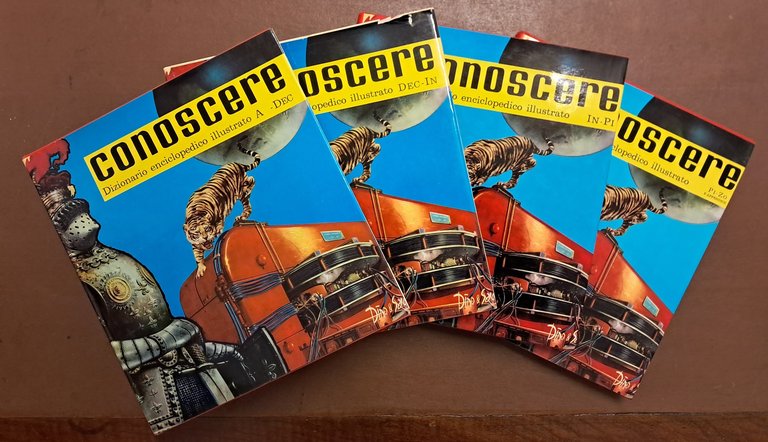 Conoscere. Dizionario enciclopedico illustrato, Fratelli Fabbri Editori, Milano 1970, 4 voll., pp. totali 800, ill. col., cm 27, legatura in tutta tela ed. con titoli in oro al dorso e al piatto e sovraccoperta.  Volume I: A-Dec, pp. 191. Volume II: Dec-In, pp. 195-384. Volume III: In-Pi, pp. 388-575. Volume IV: Pi-Zo e Appendice, pp. 578-800.  Leggere tracce d’uso, qualche strappetto senza mancanza ai margini delle sovraccoperte, minima abrasione all’ultima carta di guardia del terzo volume, tenue brunitura della carta, per il resto volumi ben conservati.