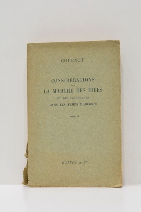 Tome II seul. 376 pages. 2 feuillets. (20,5x13cm). Broché. Couverture légèrement brunie avec quelques petites taches éprases. Dos frotté et déchiré. Coins émoussés. Cet ouvrage, publié à Paris en 1934, représente une réflexion profonde de Cournot sur l'évolution des idées et des événements à travers les temps modernes. À une époque où l'Europe se remettait lentement des bouleversements de la Première Guerre mondiale et se dirigeait vers d'autres conflits, ce texte offre un aperçu de la manière dont les courants de pensée et les événements historiques s'entremêlent et influencent la société. La présentation par F. Mentré enrichit la compréhension du lecteur en situant l'analyse de Cournot dans le contexte intellectuel et historique de l'époque, tout en établissant un pont vers les questionnements contemporains sur la progression des idées et leur impact sur le cours de l'histoire. Papier légèrement bruni avec quelques petites taches éprases. Exemplaire partiallement non-coupé. Cahier un peu déboîté.