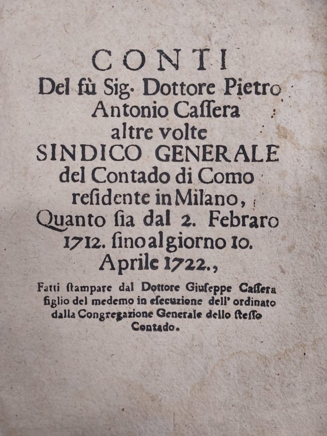Conti del fù sig. dottore [.] sindico generale del contado di Como residente in Milano, quanto sia dal 2 Febraro 1712 fino al giorno 10 Aprile 172. Fatti stampare dal dottore Giuseppe Cassera figlio del medesimo in esecuzione dell'ordinato dalla Congregazione Generale dello stesso contado.