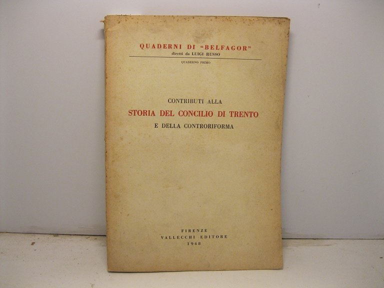 In 8, pp. VIII + 150 + (2b). Br. ed. legg. polverosa. Fa parte dei Quaderni di Belfagor diretti da Luigi Russo [I]. Con contributi di Eugenio Garin (Desideri di riforma nell'oratoria del Cinquecento); Delio Cantimori (Nicodemismo e speranze conciliari nel Cinquecento italiano); Giovanni Miegge (Le aspirazioni delle Chiese nazionali al concilio di Trento); Arturo C. Jemolo (Riforma tridentina nell'ambito matrimoniale); Giovanni Getto (La letteratura ascetica e mistica in Italia nell'eta' del concilio trentino); Luigi Firpo (L'utopia politica della Controriforma), etc.