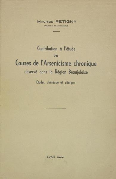 Imprimerie de Trévoux G. Patissier, 1944. In/8 broché, couverture imprimée, 80 pages. Etude pour étudier le passage possible de l’arsenic dans les vins à l’occasion des traitements arsénicaux et donc du passage dans le corps humain lors de la consommation de ce vin.