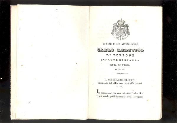 IN 8° ( cm.20 X 13,5 ), pp.28. COPERTINA MUTA D'EPOCA. E' LA CONVENZIONE CONCLUSA<BR>TRA GLI STATI LUCCHESE E PONTIFICIO PER L'ARRESTO E RECIPROCA CONSEGNA DEI<BR>DELINQUENTI, SOTTOSCRITTA IN ROMA IL DI' 28 DELL'APRILE PERCORSO, LE CUI<BR>RATIFICHE SONO STATE FORMALMENTE CAMBIATE NELLA SUDDETTA CAPITALE IL DI' 5<BR>DELL'ANDANTE GIUGNO. CONVENZIONE FIRMATA DA CARLO LODOVICO DUCA DI LUCCA<BR>E SUA SANTITA' IL SOMMO PONTEFICE GREGORIUS P.P. XVI. OTTIMA CONSERVAZIONE<BR> ID 1173.