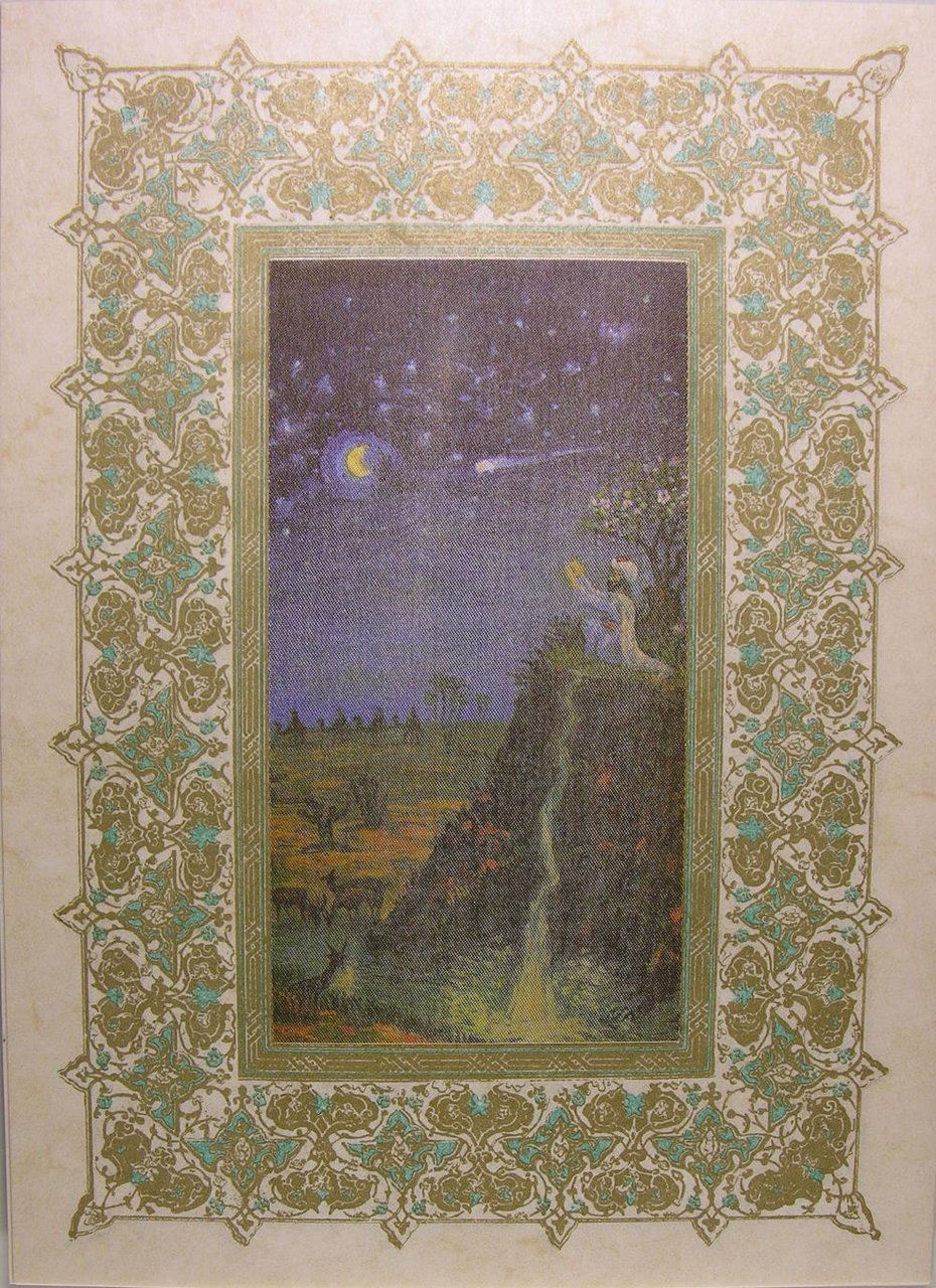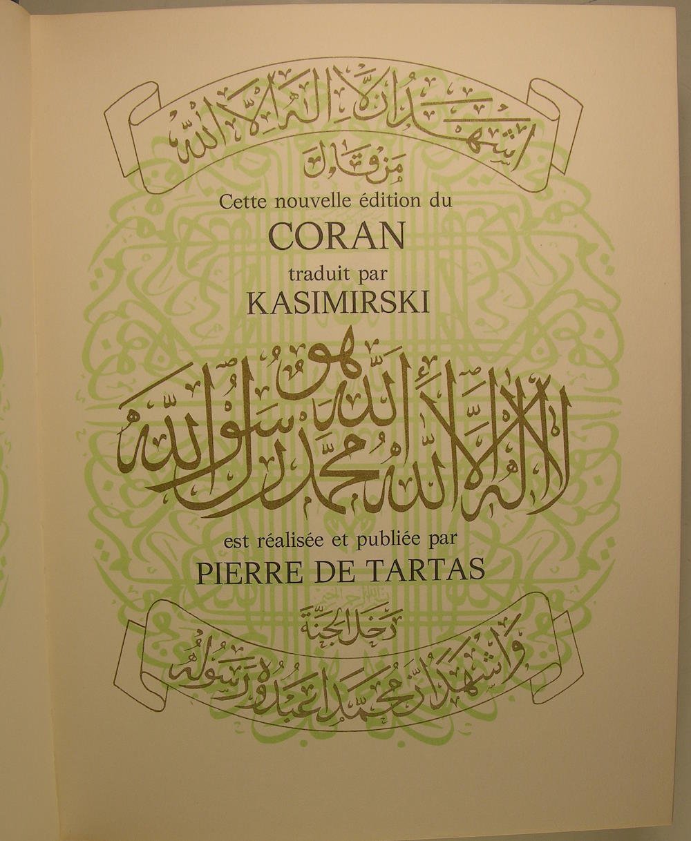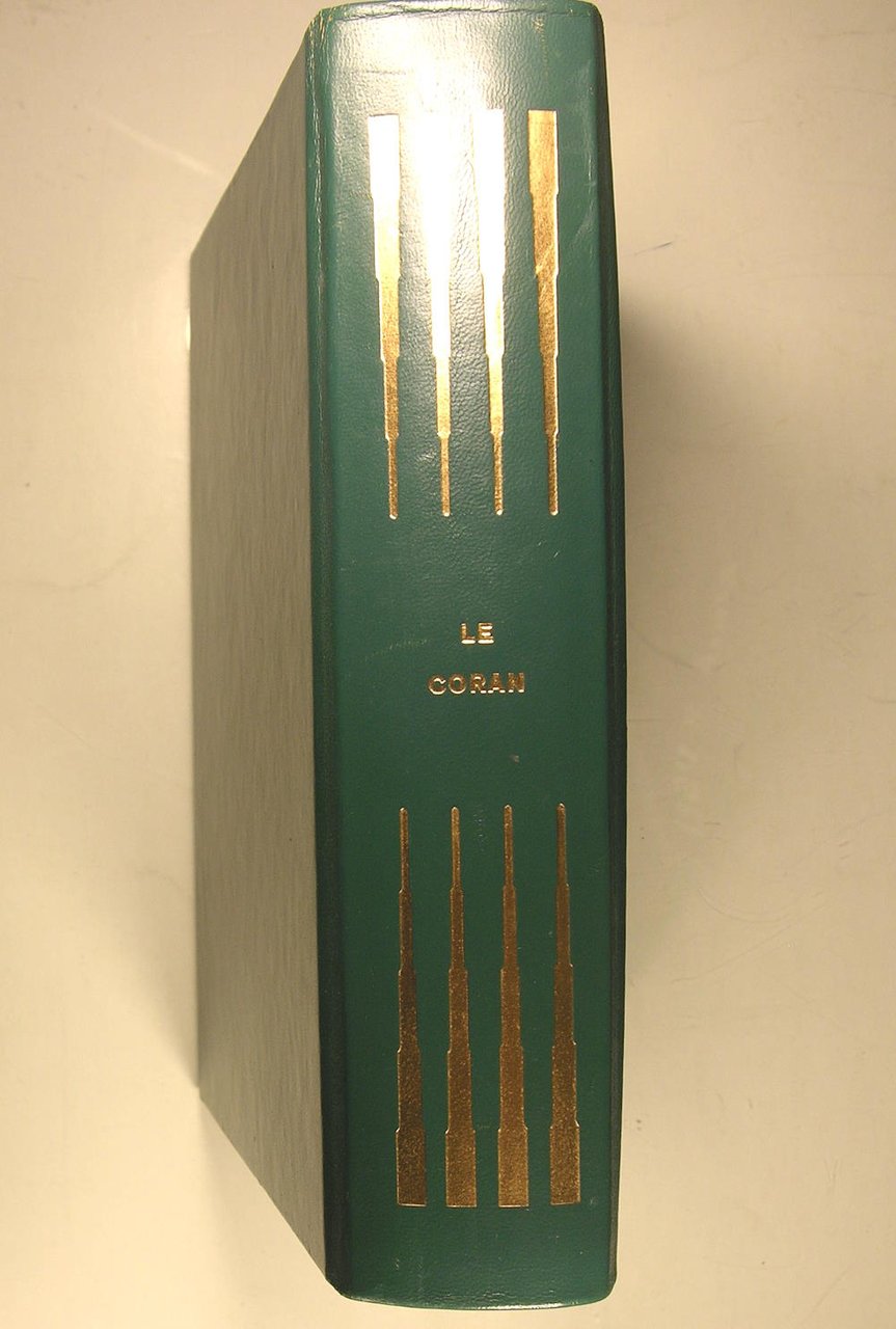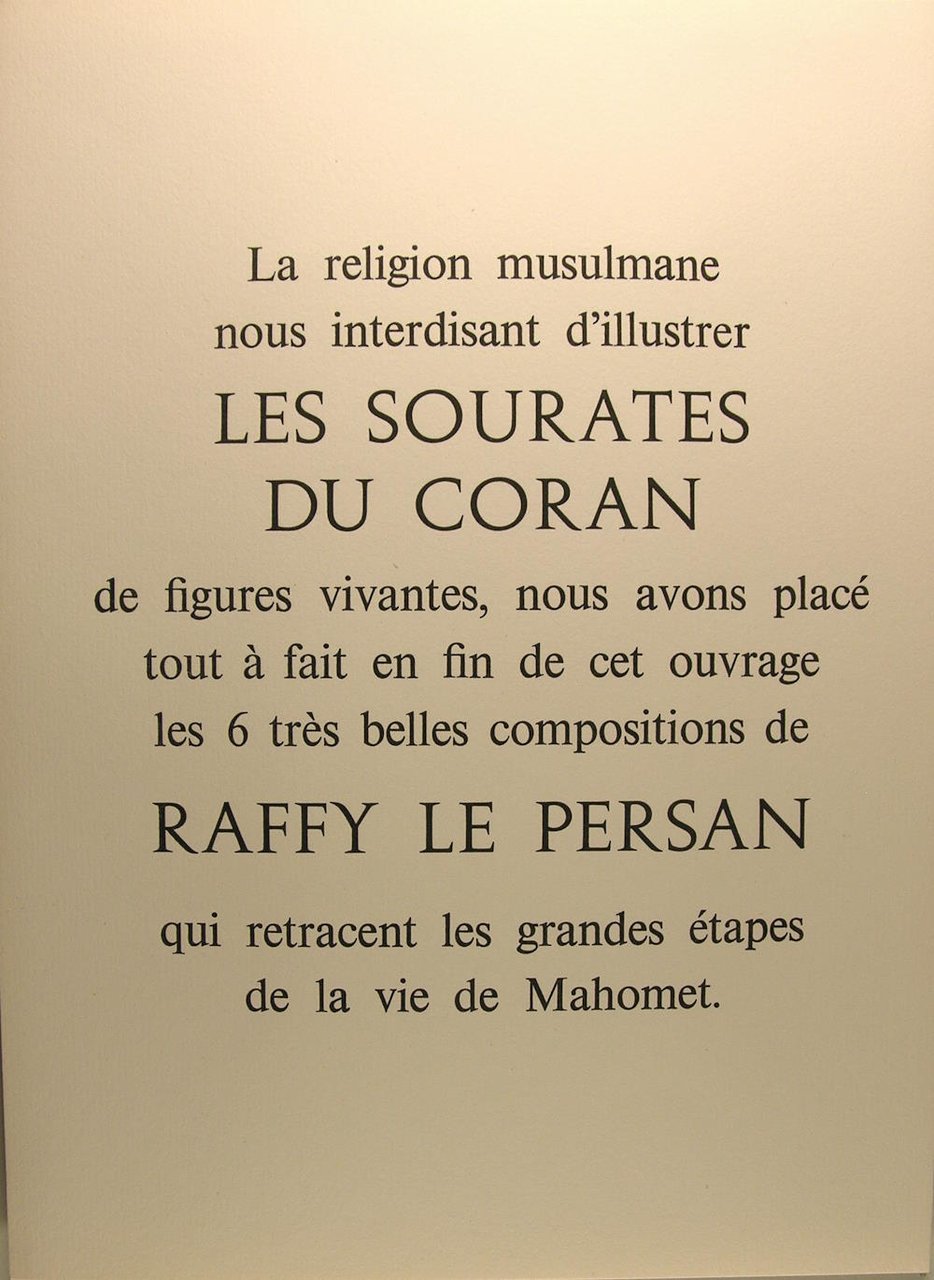 Editions Paris, Bievres - Pierre de Tartas, 1973. Petit in/4 (25 x 20 cm) reliure éditeur de Vasarely pleine basane verte à décor doré, doré sur tête, sous étui cartonné, illustrations originales en couleurs de, 376 pages. Note de l'éditeur : "La religion musulman nous interdisant d'illustrer Les sourates du Coran, de figures vivantes, nous avons placé tout à fait en fin de cet ouvrage les 6 belles compositions de Raffy le Persan, qui retracent les grandes étapes de la vie de Mahomet.
