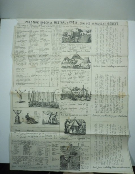 Foglio ripiegato (aperto misura cm 48 x 32 circa) con illustrazioni. Alcuni fori nella parte inferiore del foglio e riparazione con nastro adesivo di uno strappetto. Bel documento illustrato, non datato, ma ascrivibile al 1880 circa, delle corderie prodotte da questa bottega artigiana ginevrina Mestral e Coste. Il testo e' in francese con alcune parti in traduzione italiana. Fra i prodotti citati apparecchi ginnici: anelli, corde, corde per saltare, cavalletti, apparecchi elastici, ecc. ma anche amache, varie tipologie di tende da campeggio, ecc. Testo stampato al solo recto, il verso e' bianco con poche annotazioni manoscritte con lapis rossa.