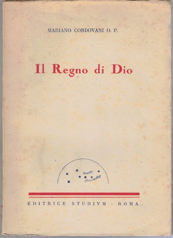 Mariano Cordovani o.p., Il Regno di Dio, con prefazione del Cardinale Carlo Salotti, editrice Studium, Roma 1944, terza ed. aumentata, pp. 370, cm 21, br. ed. Leggere tracce d’uso, minime fioriture a brossura e prime e ultime carte, leggera brunitura della carta, per il resto ben conservato. Parzialmente intonso.