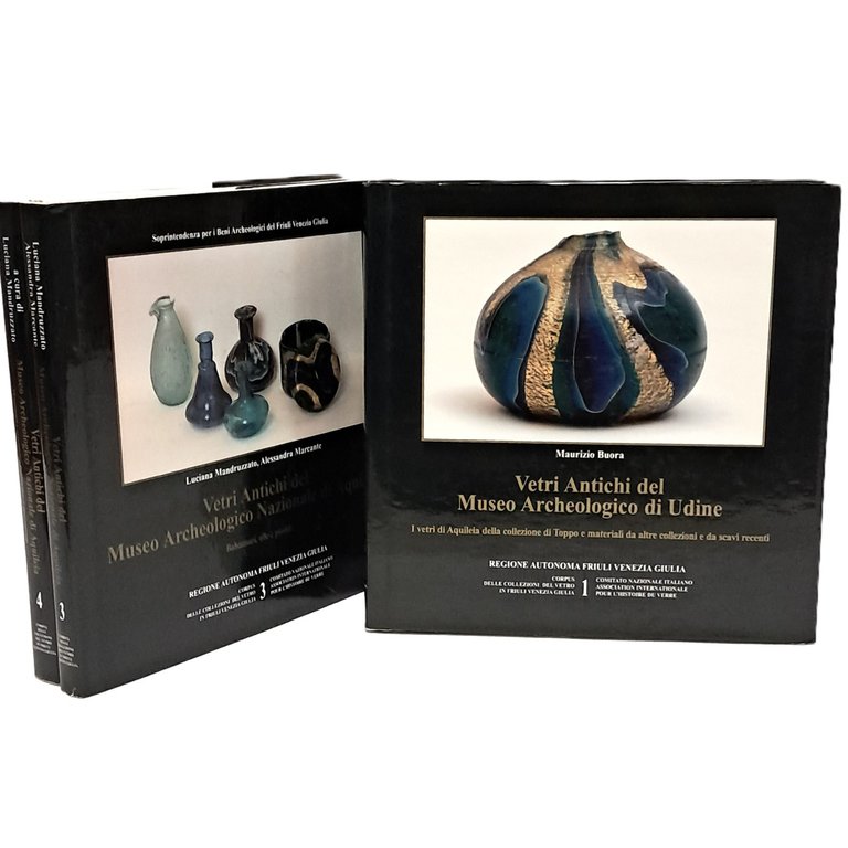 PRIMA EDIZIONE, collana in quattro volumi in cui vengono raccolti i cataloghi dei musei della regione, quello di Udine con i vetri di Aquileia della collezione di Toppo e materiale da altre collezioni e da scavi recenti (I), quello di Aquileia con il vasellame da mensa (II), balsamari olle e pissidi (III), ornamenti e oggettistica e vetro pre e post romano. Con la pubblicazione del primo volume del Corpus friulano, curato da Maurizio Buora e dedicato al Museo di Udine, erano state già poste le basi per riaffrontare i problemi connessi ai materiali aquileiesi, poiché la maggior parte dei pezzi conservati al Museo di Udine, in particolare quelli della collezione di Toppo, provengono dalla città altoadriatica. Maurizio Buora e Luciana Mandruzzato avevano anticipato in questo primo volume alcune osservazioni sulla produzione vetraria aquileiese, osservazioni che, alla fine dello studio dei vetri del museo di Aquileia, saranno sicuramente ampliate sulla base della totalità dei materiali presi in considerazione. Alle collezioni del Museo Nazionale di Aquileia sono dedicati i successivi volumi del Corpus friulano, curati da Luciana Mandruzzato e Alessandra Marcante. Il primo volume, edito nel 2005, ha esaminato il vasellame da tavola, gli altri prenderanno in considerazione tutti i restanti oggetti presenti nelle collezioni del Museo, compresi quelli d’ornamento. In questi volumi troverà spazio, oltre alla storia della formazione della raccolta dei vetri (che sarebbe stato forse opportuno avere in premessa), anche l’elaborazione critica dei nuovi dati emersi dall’analisi globale dei pezzi aquileiesi, una parte dei quali non era stata considerata al tempo della pubblicazione di Carina Calvi, o perché frutto di successive acquisizioni o perché, a volte per lo stato di frammentarietà, non ritenuta allora degna di menzione o utile a definire meglio il panorama delle presenze locali. Cartonati con sovracc illl. Buone condizioni.
