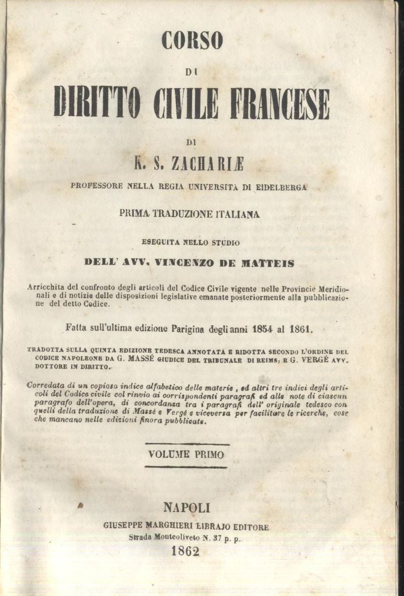 CORSO DI DIRITTO CIVILE FRANCESE Zachariae Volume I 1862 Marghieri libro antico