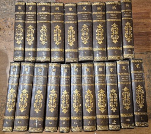 OPERA SCOMPLETA DI 20 SU 21 VOLUMI (manca il volume 6)CORSO DI DIRITTO CIVILE SECONDO IL CODICE FRANCESE. PRIMA TRADUZIONE ITALIANA SULLA SECONDA EDIZIONE PARIGINA, CORREDATA DI NOTE DIRETTE PRINCIPALMENTE AD ILLUSTRARE LE LEGGI CIVILI PEL REGNO DELLE DUE SICILIE Napoli, presso Carlo Cataneo e poi dalla tipografia di Nicola Mosca 1832-1842. XVI, 552 + 598 + 781 + 695 + 694 + 789 + 711 + 904 + 648 + 563 + 696 + 755 + 674 + 667 + 590 + 706 + 643 + 630 + 720 + 692 pagine. Copertine coeve in mezza pelle con titoli e fregi dorati al dorso e piatti marmorizzati. Stato di conservazione: molto buono (fioriture, piccole spellature ai piatti, piccola macchia di inchiostro all'angolo del volume 20, qualche piccola gola d'umido ad alcuni volumi) Libro antico legge avvocati giurisprudenza