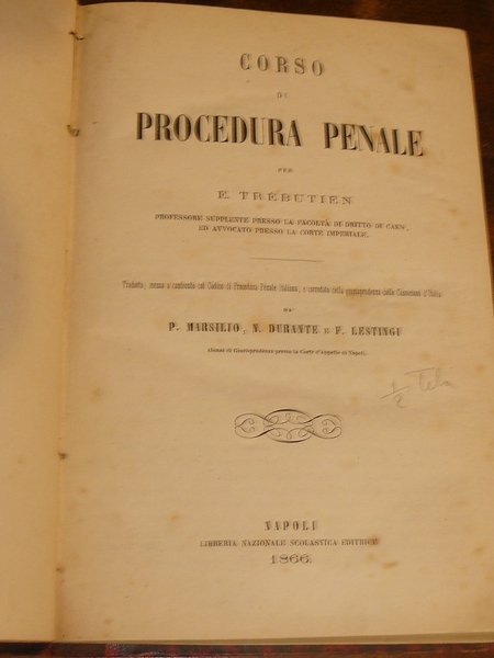 Corso di procedura penale. Tradotto, messo a confronto col codice di Procedura Penale Italiano e corredato della giurisprudenza delle Cassazioni d'Italia da P. Marsilio, N. Durante e F. Lestingi.