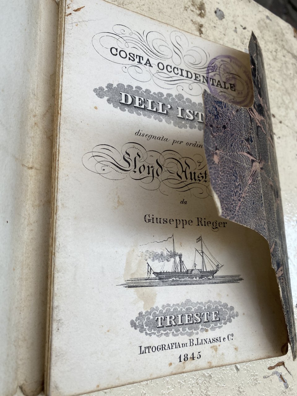 Rarissimo libro in -16 composto da un lungo susseguirsi di vedute della costa occidentale dell'Istria in litografia color seppia continuativo nella sua dislocazione lungo il foglio che misura aperto completamente 3 metri. Nelle vedute si trovano sparsi traghetti e barche, sulle coste sono visibili paesi e castelli. Il libretto ha una rilegatura d'epoca in carta marmorizzata che chiude con un incastro il libretto cos da proteggerlo. Buone condizioni generali, qualche fioritura sparsa.