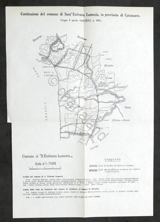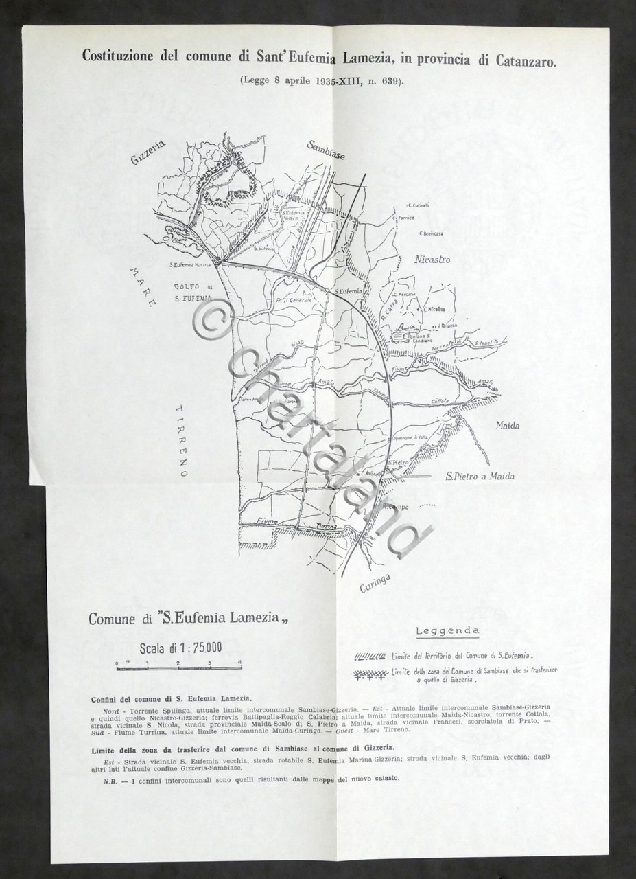 Costituzione Comune di Santa Eufemia Lamezia (Catanzaro) - Planimetria confini - 1935 Un foglio ripiegato, dimensioni: 24 x 36 cm. ca. Lingua italiana. Condizioni molto buone.