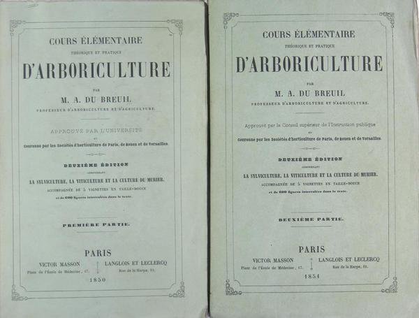 Paris, Victor Masson, 1850. 2 volumes petit in-8 brochés, couverture imprimées, 692 figures in-texte, 5 planches en taille-douce dont 1 dépliante, 859 pages, 31 p. de catalogue. Tranches non massicotées ; hormis quelques rousseurs éparses, un exemplaire frais. Comprend la sylviculture, la viticulture et la culture du murier. Bel ouvrage avec de nombreuses illustrations à pleines pages (tailles des arbres en espalier).
