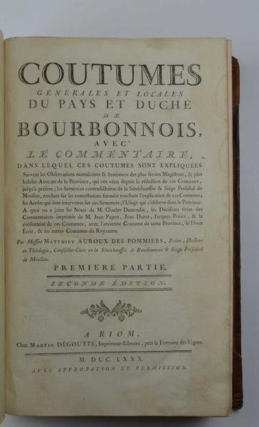 Due volumi legati in uno in-folio (cm. 40), pp. vi, iv (2) 486 (38); (2) xxxii, 388 (28) vi + 64 con il titolo: Les anciennes coutumes du pays et Duché de Bourbonnois. Con belle testate e capolettera incisi. Legatura coeva in piena pelle. Dorso controfondato. e segni d'uso alla legatura, peraltro internamente esemplare fresco e ben conservato.