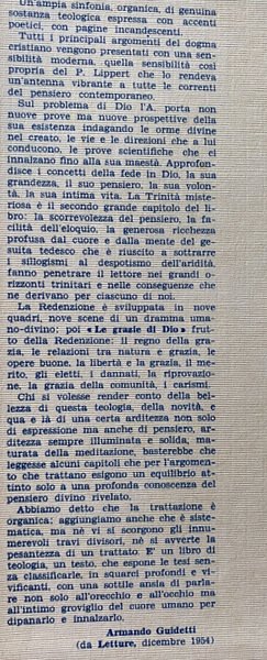 Chi si volesse render conto della bellezza di questa teologia, della novità, e qua e là di una certa arditezza non solo di espressione ma anche di pensiero, arditezza sempre illuminata e solida, maturata della meditazione, basterebbe che leggesse alcuni capitoli che per l'argomento che trattano esigono un equilibrio attinto solo a una profonda conoscenza del pensiero divino rivelato. Abbiamo detto che la trattazione è organica; aggiungiamo anche che è sistematica, ma nè vi si scorgono gli innumerevoli travi divisori, nè si avverte la pesantezza di un trattato.