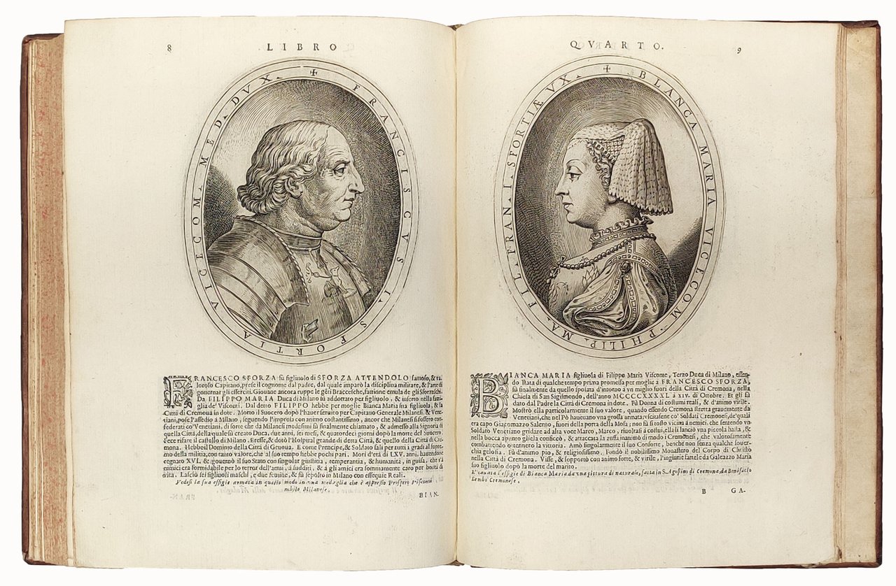 Two works in one volume, 4to (266x200 mm). [16], 228 (i.e. 224, missing pp. 161-164 in pagination) [24]; 32 pp. and [6] engraved plates (4 folding). Collation: †4 A-Ee4 a-c4; A-D4. With a beautiful engraved title page, woodcut initials, head- and tail-pieces, and 33 in-text engraving portraits. The second work starts at l. A1 with a separate title page (Historia delle vite de duchi et duchesse) in an ornamental frame and with a central woodcut vignette. Paneled calf with lettering piece on the spine, ribbed spine, red sprinkled edges (slightly worn, hinges cracked, head- and bottom-spine damaged). A genuine, very good copy with wide margins.