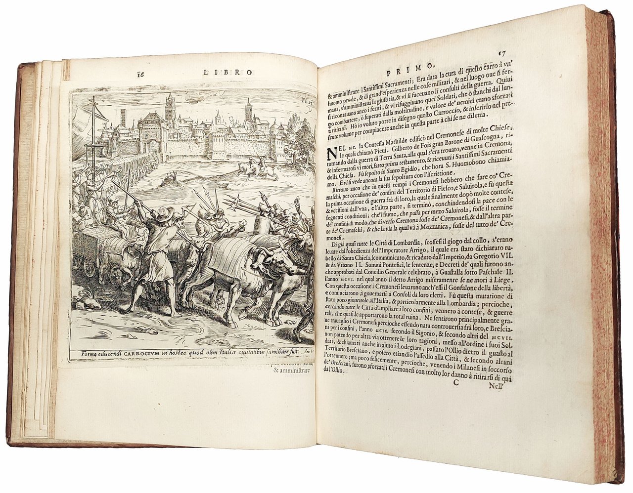 The engravings of the work include: the allegorical title page with the royal coat-of-arms of King Philip IV; three folding plates showing a map of the city, the Tower and the Cathedral of Cremona; two full-page engravings depicting the Baptistery of the city; a folding plate after the l. Ee4 depicting a large map of the city printed in three leaves and dated 1583; the beautiful engraving at the l. B3 recto on the procession of the ‘carroccio' from the Cremona gate, whose profile stands out against the background; the oval portrait of Antonio Campo (164x136 mm) at l. †4 recto; and 32 medallion portraits of illustrious Cremonese as well as dukes and duchesses of the Duchy of Milan (the one at p. 72 is a woodcut). For some of these portraits the original source is given, i.e. that of Carlo V is by Giulio Campo, the author's brother, or that of Massimiliano Sforza, a copy of a drawing by Leonardi da Vinci.