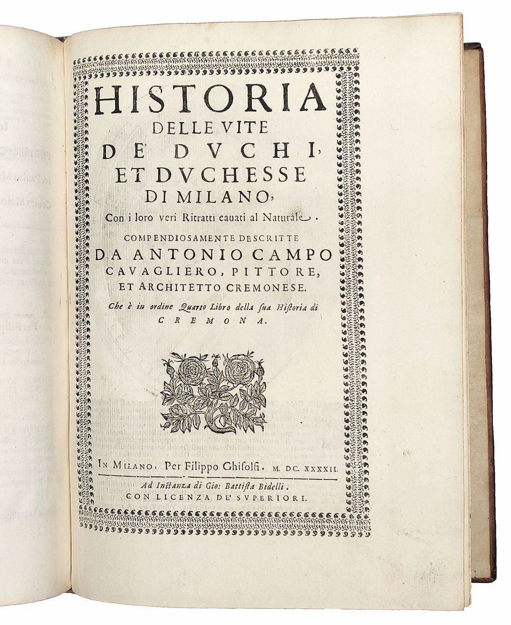 [bound with:] EIUSDEM. Historia delle vite de' duchi et duchesse di Milano, Con i loro veri Ritratti cavati al Naturale Compendiosamente descritte da Antonio Campo, cavagliero, pittore, et architetto cremonese. Che è, in ordine, Quarto Libro della sua Historia di Cremona. In Milano, per Filippo Ghisolfi ad istanza di Gio. Battista Bidelli, 1642.