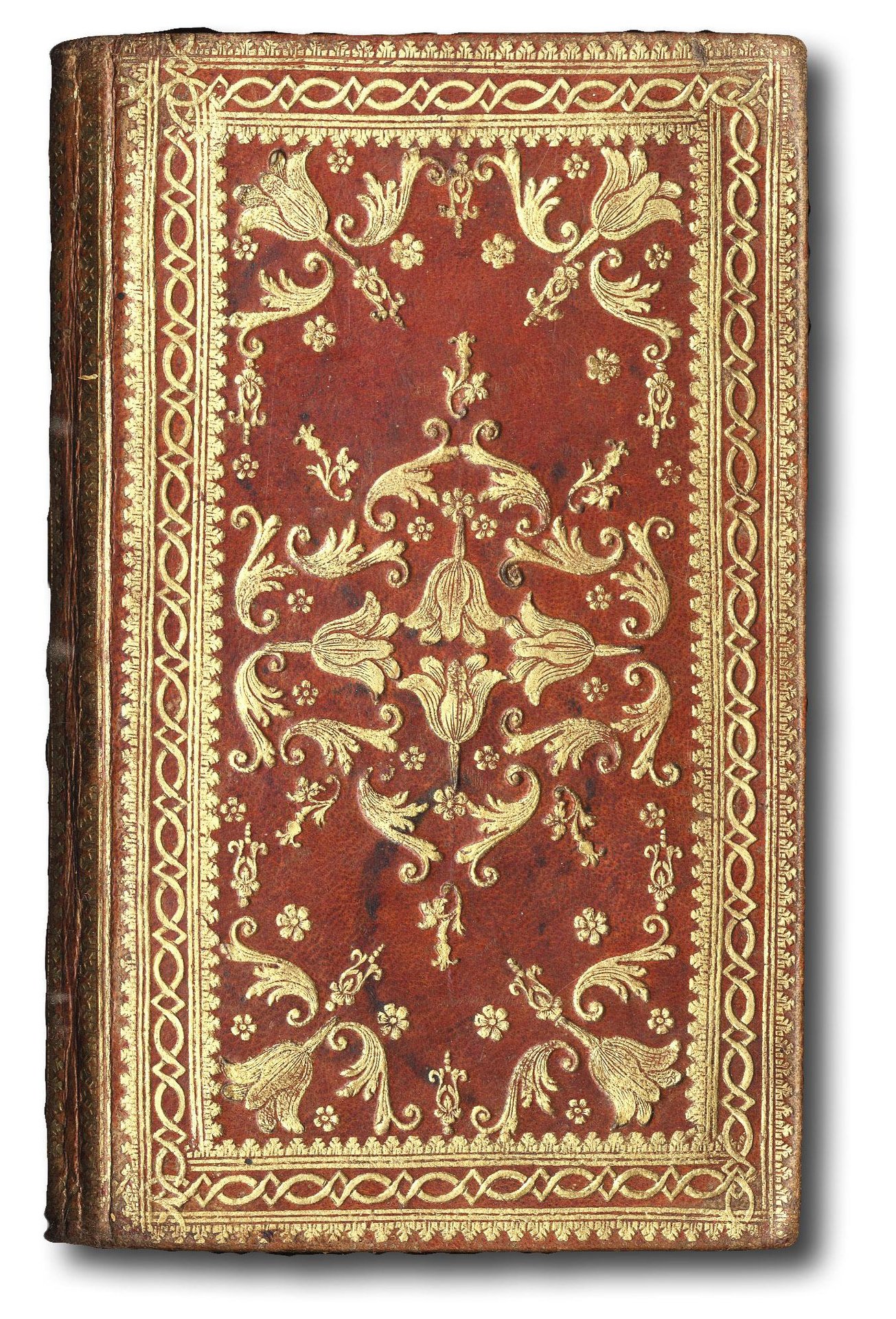 >in-8 piccolo (mm 153x90), pp. 44, (6 bianche), bella legatura coeva romana in marocchino rosso, triplice cornice e ricchi fregi floreali con tulipani e fogliette, impressi in oro ai piatti, dorso liscio con decorazioni stilizzate a rotella, carta goffrata in oro su fondo arancione alle sguardie. Bellissima legatura, ben conservata, attribuibile al "Maestro dei tulipani" legatore operante presso la biblioteca Vaticana durante la prima metà del XVIII secolo. Sono conosciute legature da lui realizzate per la famiglia Doria, Pamphili, per il Cardinale Cloche e per il Cardinale Albani.