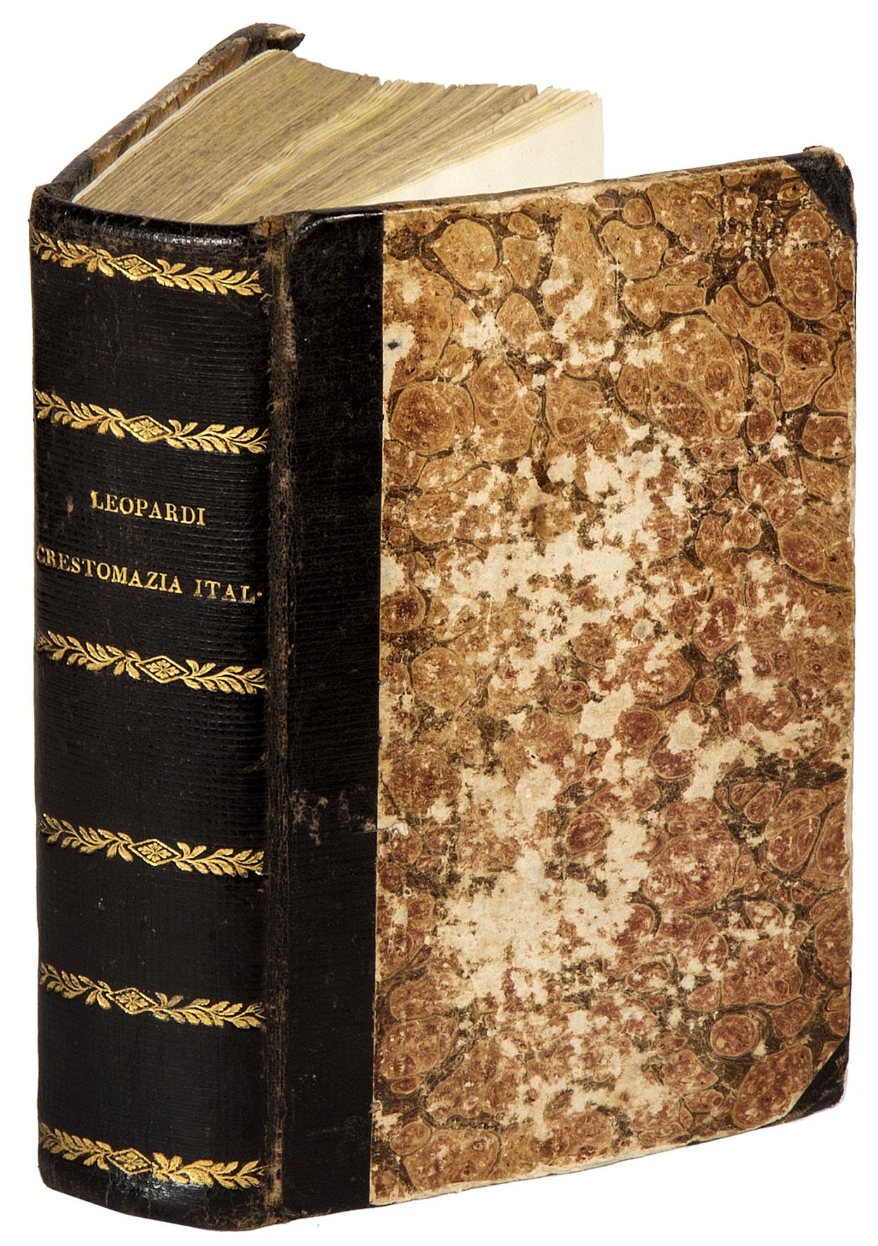 PRIMA EDIZIONE di questa antologia di poeti italiani, che fu commissionata al Leopardi dal libraio Antonio Fortunato Stella come testo di sussidio per l'educazione e l'istruzione della gioventù. Destinata quindi agli studenti, nonostante una tiratura di duemila esemplari, l'opera è divenuta di una certa rarità. Comprende componimenti di circa ottanta poeti italiani, ripartiti per secoli dal Quattrocento all'Ottocento. Si tratta per lo più di testi che il Leopardi possedeva nella biblioteca di famiglia e che riflettono la sua predilezione per il genere lirico e comico-satirico. L'anno precedente presso lo stesso editore era uscito il volume riguardante la prosa.