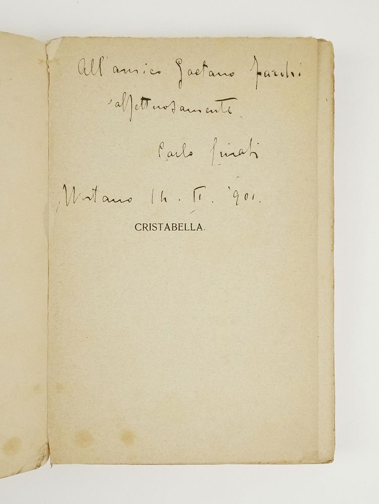 LIBROEdizione originale.Esemplare nella prima emissione: la copia dell’editore Gaetano Facchi, pregiata dalla dedica autografa dell’autore: «All’amico Gaetano Facchi, affettuosamente | Carlo Linati | Milano 14. II. ’901 [sic, probabilmente per ’910]». Diffusi segni del tempo alla copertina, nel complesso buon esemplare”Rarissimo primo libro dell’autore, pubblicato in proprio presso la tipografia Zerboni, con indicazione di «Edizione fuori commercio» in copertina. In seguito (ca. 1913) la stessa tiratura fu ricopertinata sotto le insegne dello Studio Editoriale Lombardo, sigla editoriale di breve durata fondata dallo stesso Linati assieme a Gaetano Facchi (che poi continuerà in proprio come Facchi Editore) e Mario Puccini. Raccolta di otto racconti tra i quali «Il tribunale verde» — che uscì in plaquette per nozze pochi anni prima.