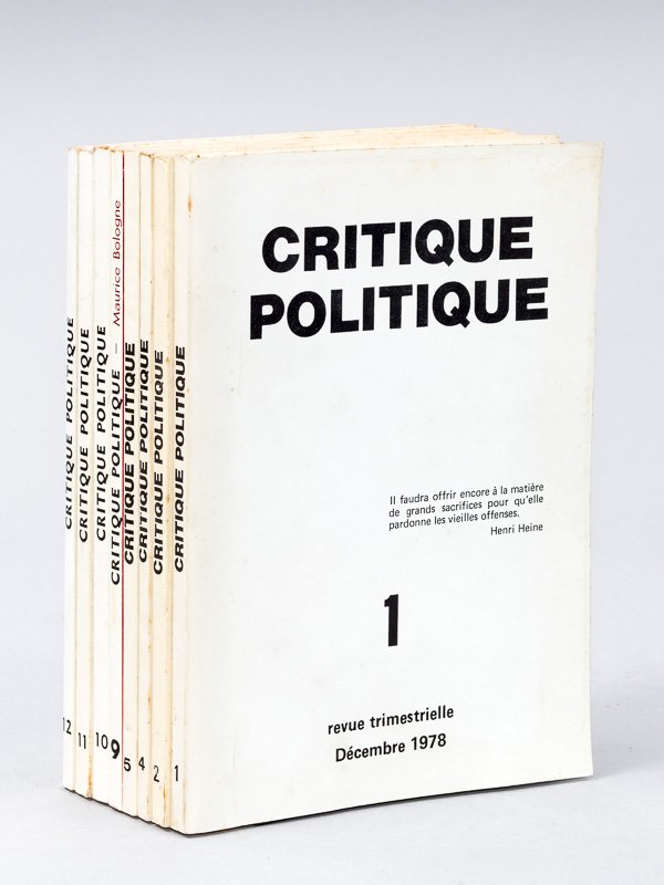 Critique Politique. Revue Trimestrielle [ Lot de 8 numéros ] N° 1 : Décembre 1978 - 2 : Mars, avril, mai 1979 - 4 : Novembre, décembre, janvier 1979-1980 - 5 : Mai 1980 - 9 : Juillet 1981 : L'insurrection prolétarienne de 1830 en Belgique - 10 : Décembre 1981 - 11 : Mars 1982 - 12 : Septembre 1982