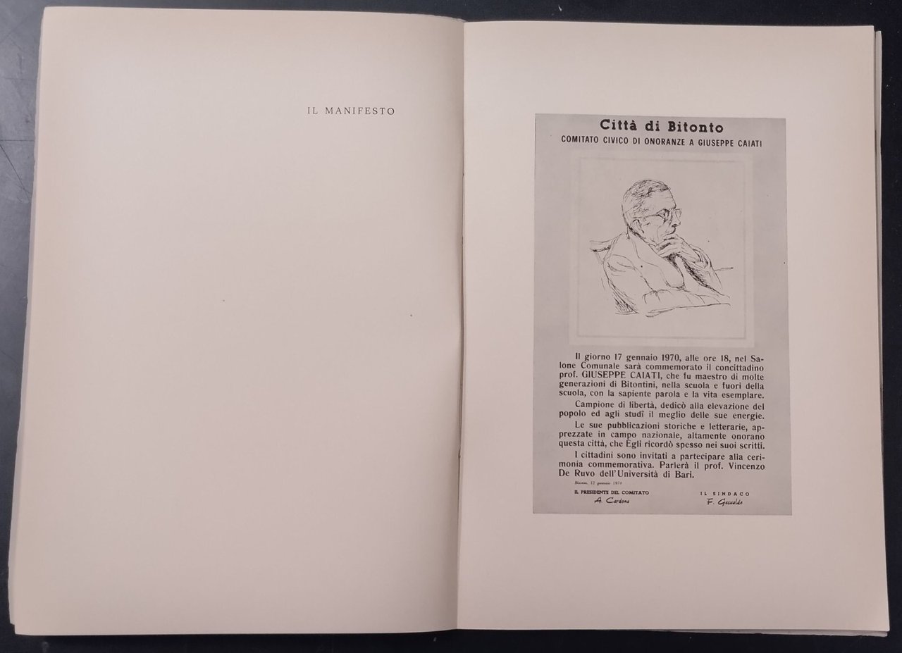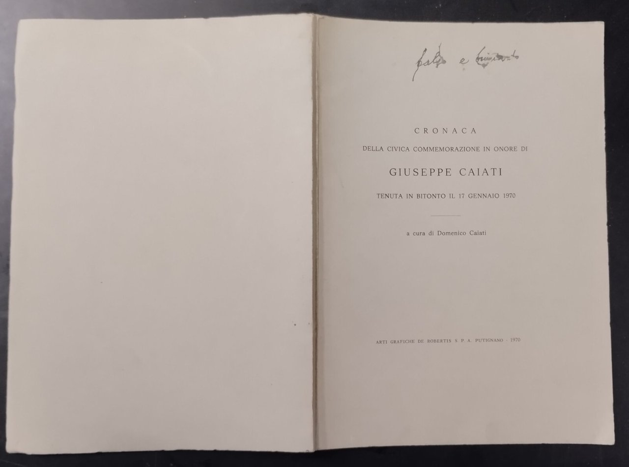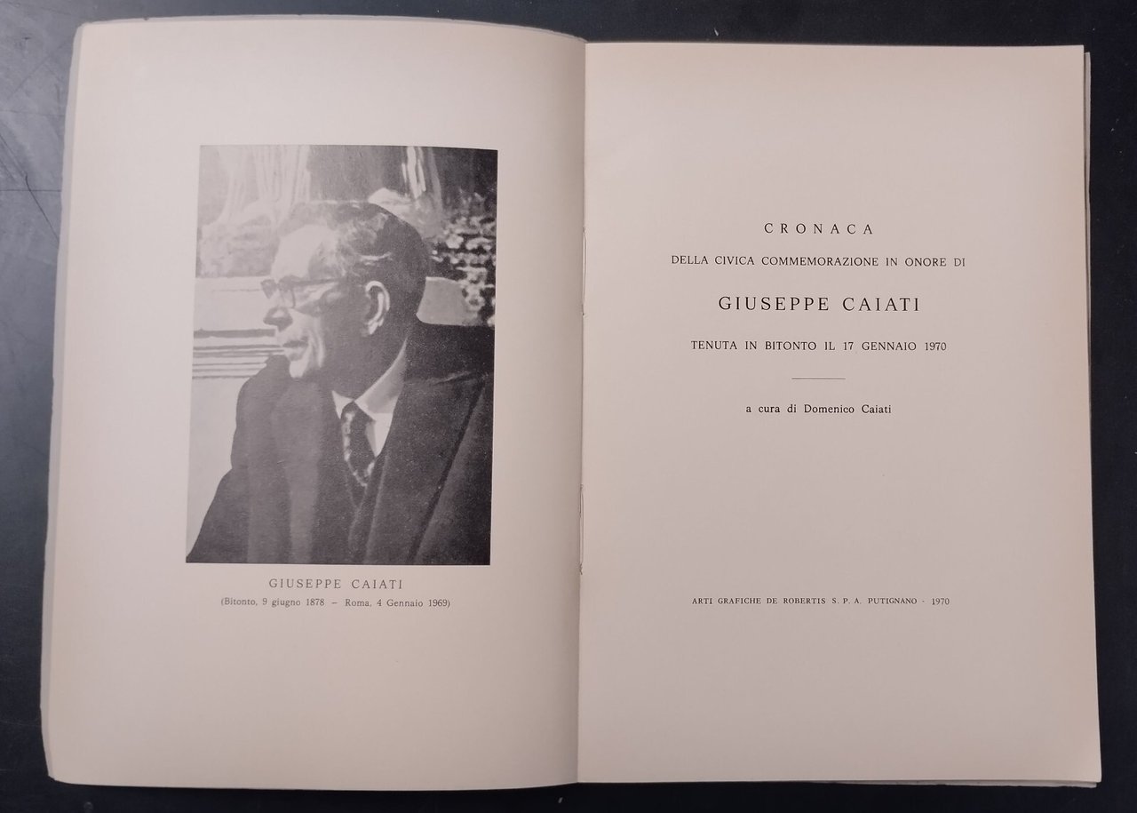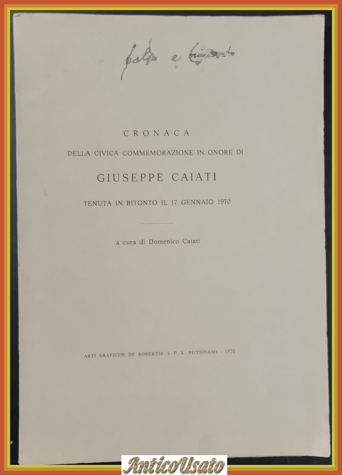 CRONACA DELLA CIVICA COMMEMORAZIONE IN ONORE DI GIUSEPPE CAIATI tenuta in Bitonto il 17 Gennaio 1970 a cura di Domenico Caiati . 53 pagine, foto commemorativa in bianco e nero furi testo. Copertina editoriale in tutta tela. Stato di conservazione: molto buono (pagine normalmente ingiallite, scritto a penna al piatto anteriore, sottolineature con pennarello blu) Libro usato saggistica storia locale