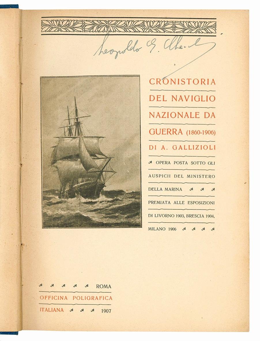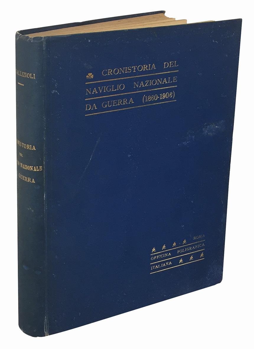 In 8vo (mm 241x173); pp. VI, [2], 614. Frontespizio stampato in rosso e in nero, numerose illustrazioni in bianco e nero nel testo. Carta leggermente ed uniformemente brunita. Tela editoriale con titolo impresso in oro al dorso e al piatto anteriore. Lievi abrasioni ai piatti, dorso un po' sporco. Interessante ed approfondito studio nel quale di ogni imbarcazione della R. Marina che solcò il mare tra il 1860 e il 1906 oltre ai dati tecnici e di costruzione, sono indicate le operazioni belliche alle quali presero parte nonchè le storie più interessanti che le videro protagoniste.